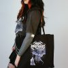 💀 These tote bags are 100% black cotton canvas, with 12oz worth of space. They measure 43cm wide, by 38cm high by 10cm deep – so a bit bigger than your average tote. They come with longer handles to give you plenty of space to move around too. These bags are also 100% biodegradable at the end of their life! Please cool wash, no tumble dry with care due to the print-screening.