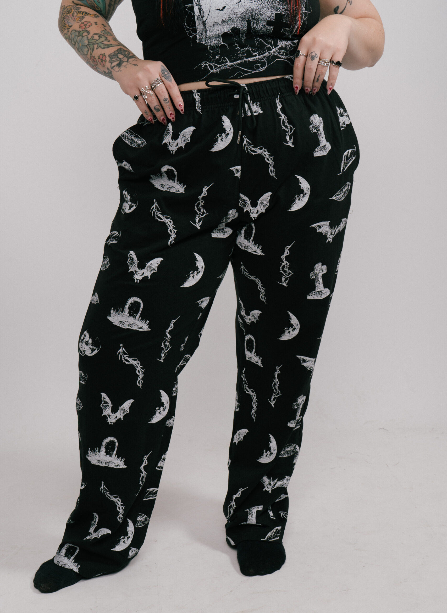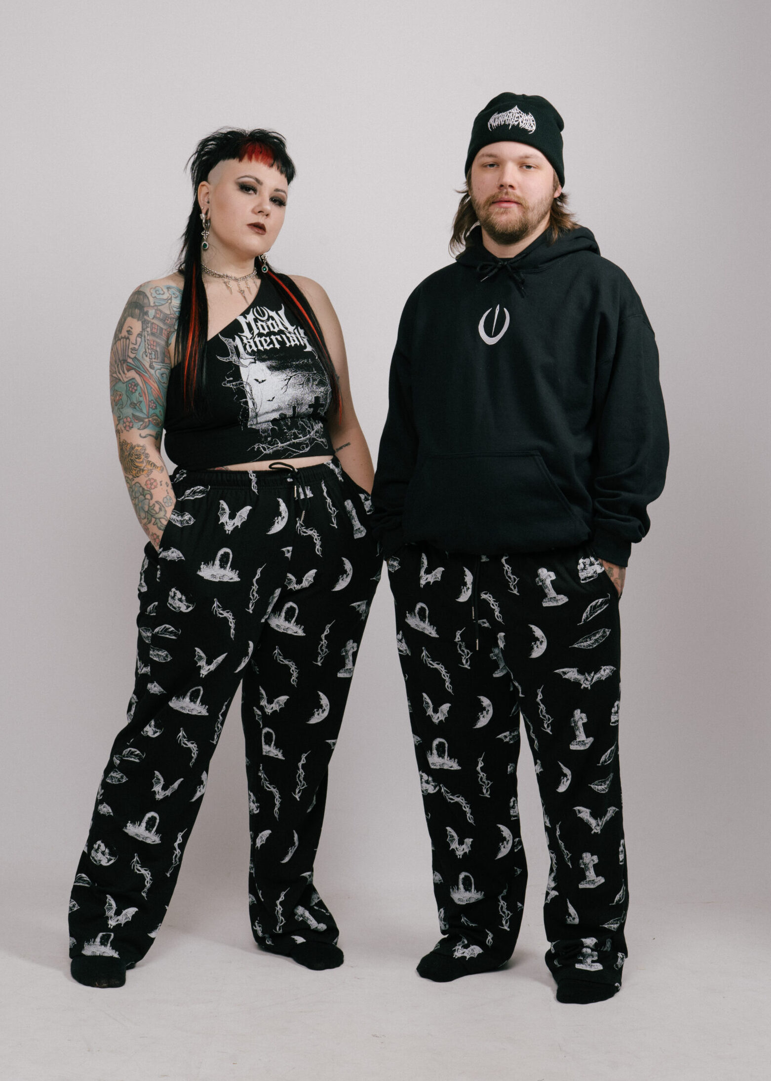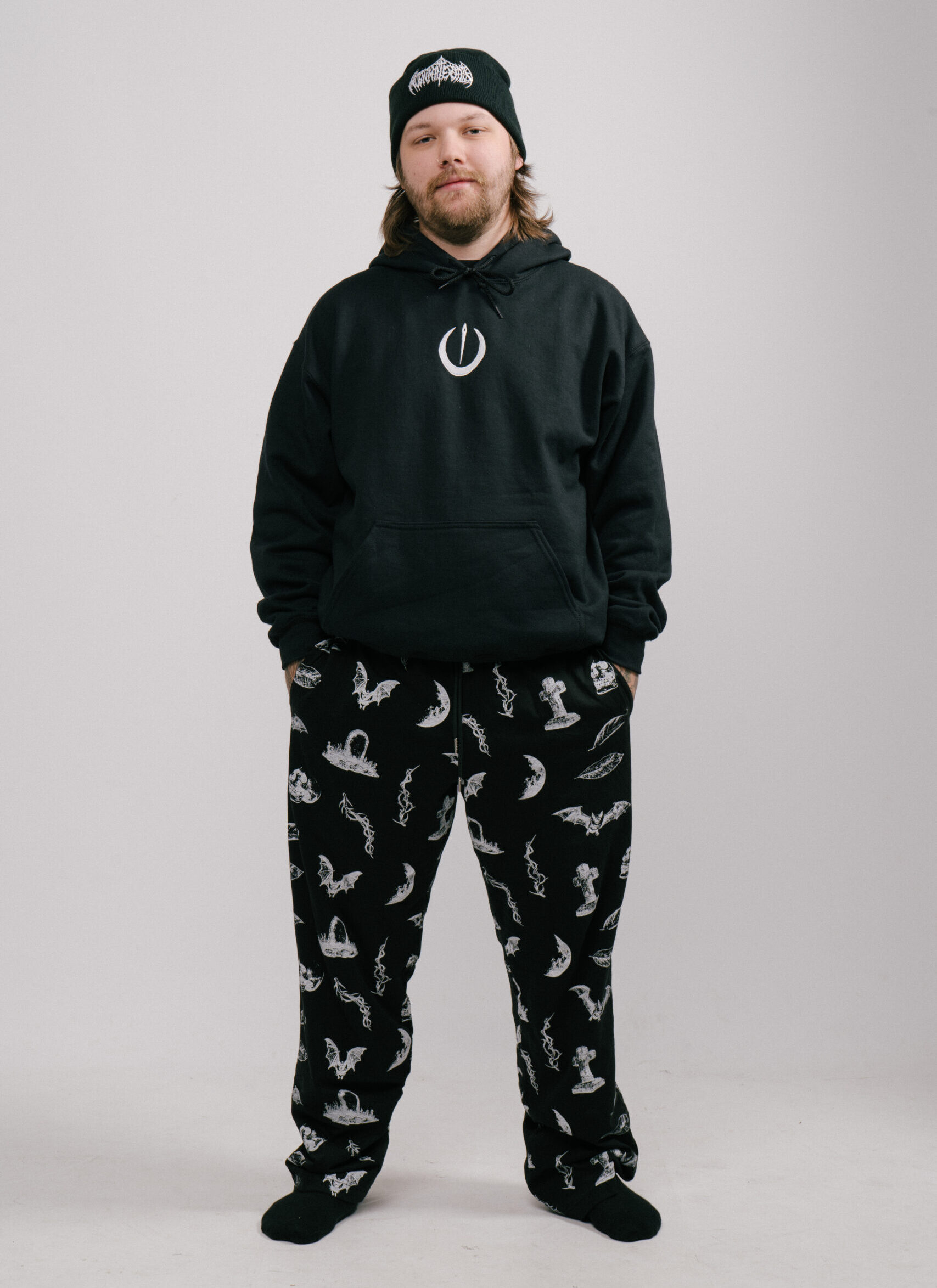 🦇 Made from a custom designed & printed cotton, these lounge bottoms are the perfect way to keep out the cold this winter. Extra added length (31-32inch inseam depending on size) to help for those with longer legs, pockets for all your junk and to complete the look we even have matching hoodies & tees!
